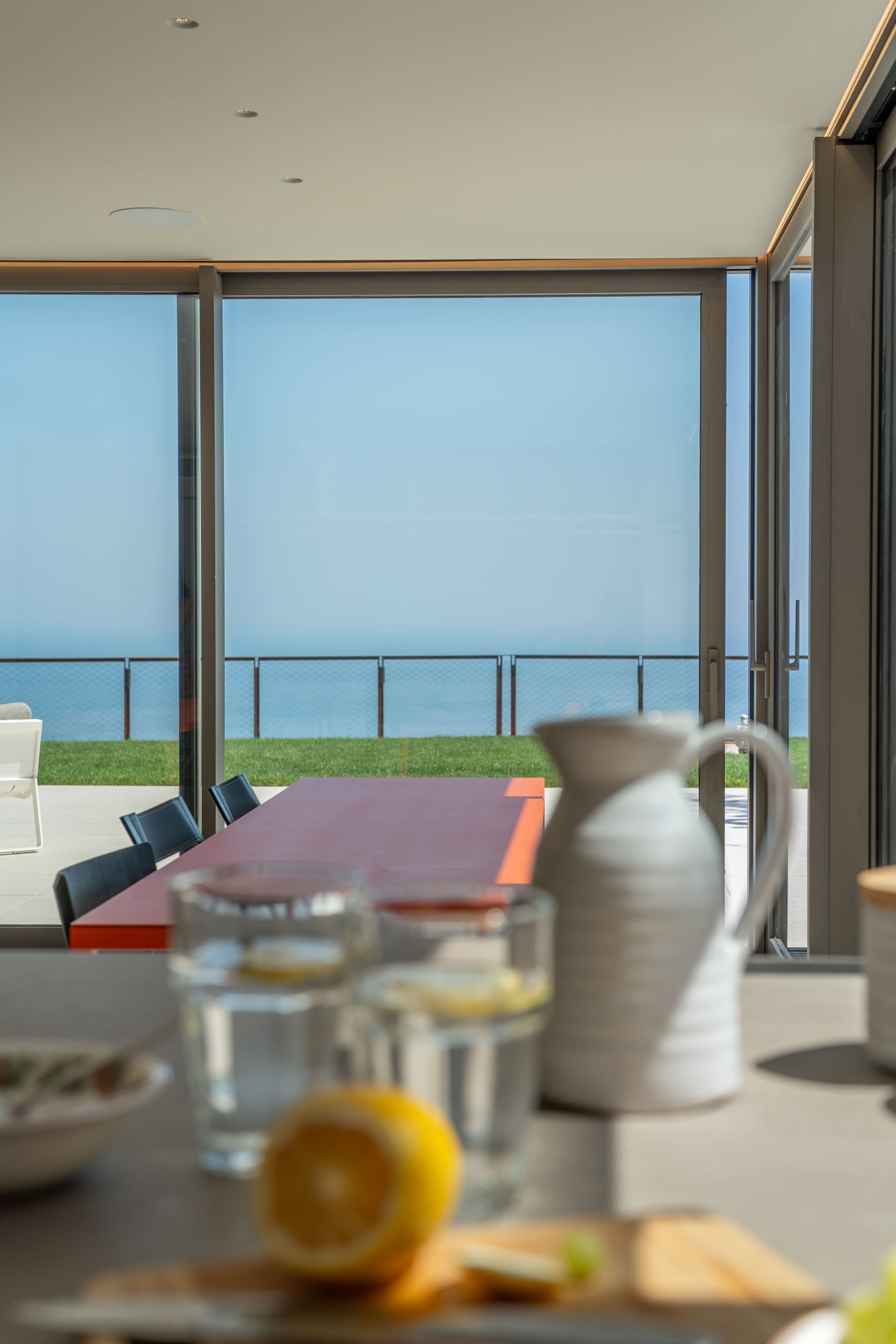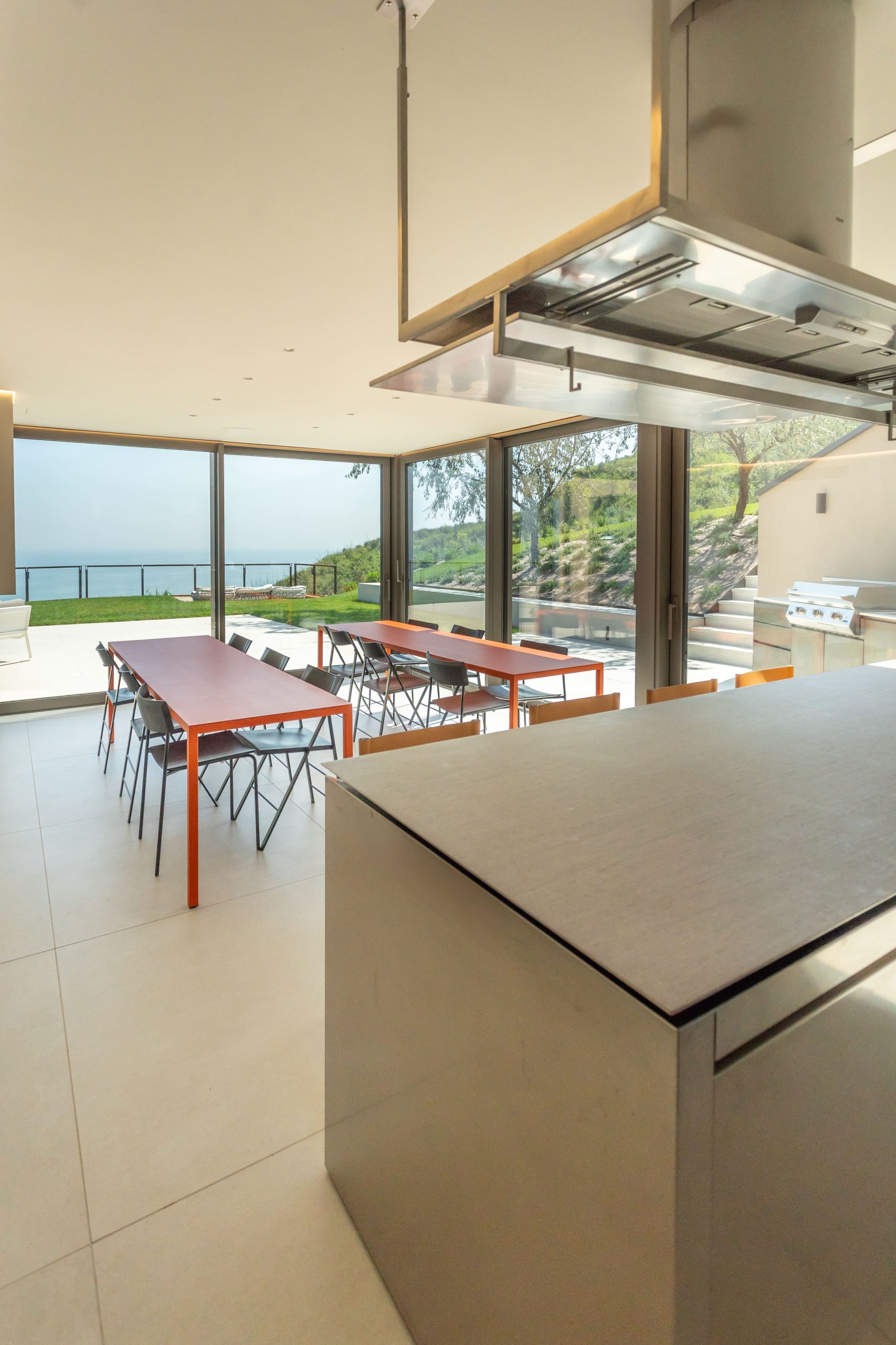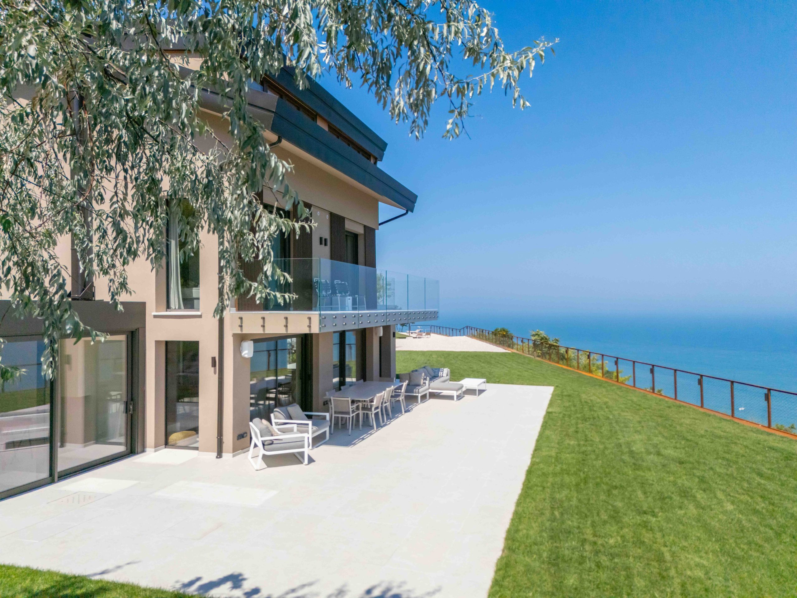 Terrazza Incanti domina il paesaggio dal crinale del Monte San Bartolo. Gli interni essenziali e luminosi si aprono verso il giardino, le vetrate portano dentro la luce e il mare. Ogni ambiente vive in dialogo con il paesaggio, tra il blu dell’orizzonte e il verde del parco. La veranda, le cucine esterne, la piscina: ogni spazio è pensato per vivere all’aperto, con il comfort del design e l’eleganza sobria del lusso naturale.