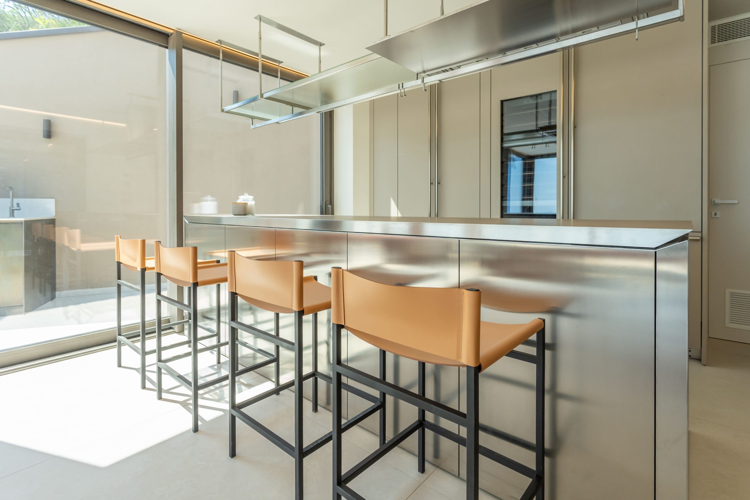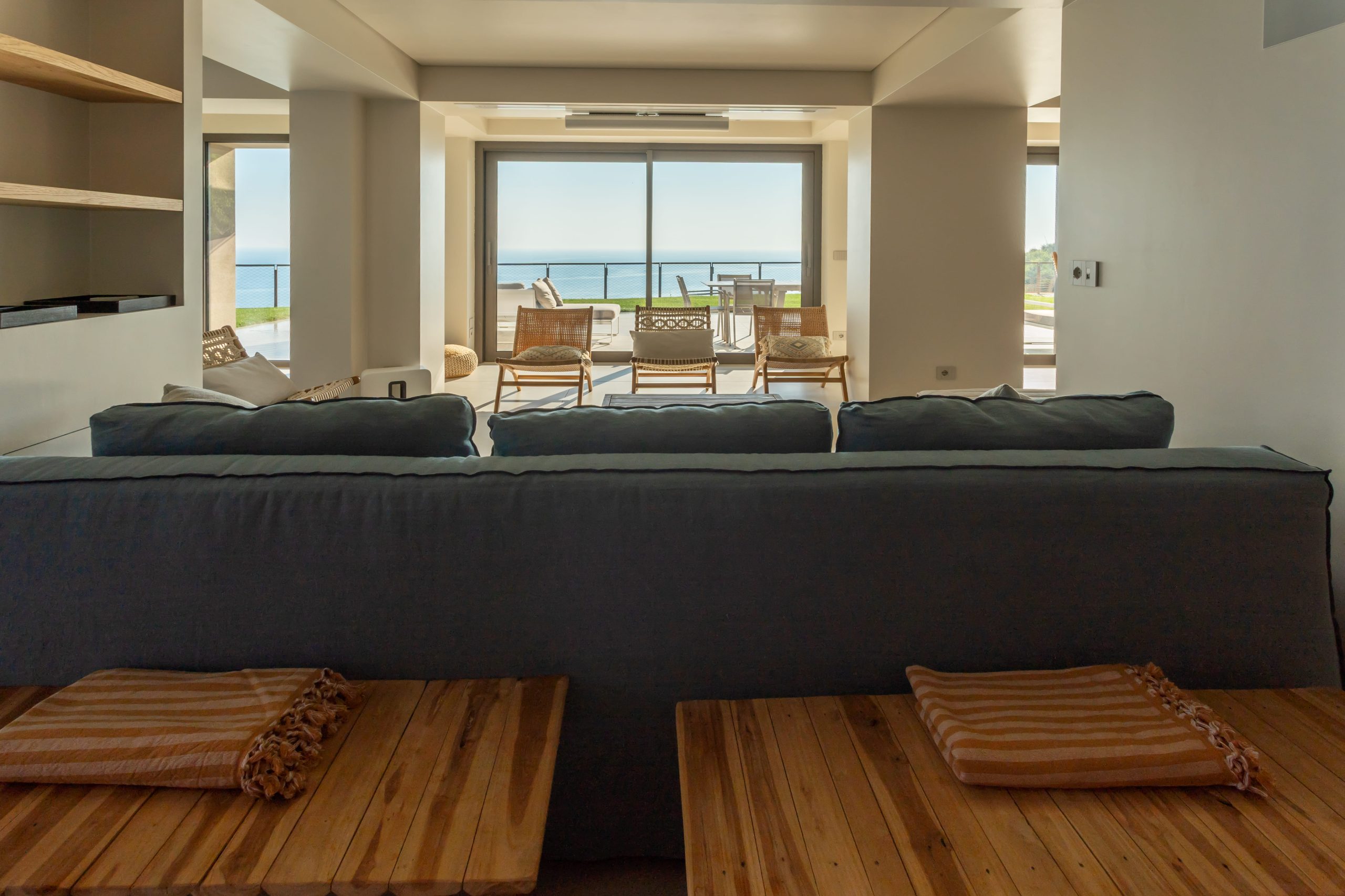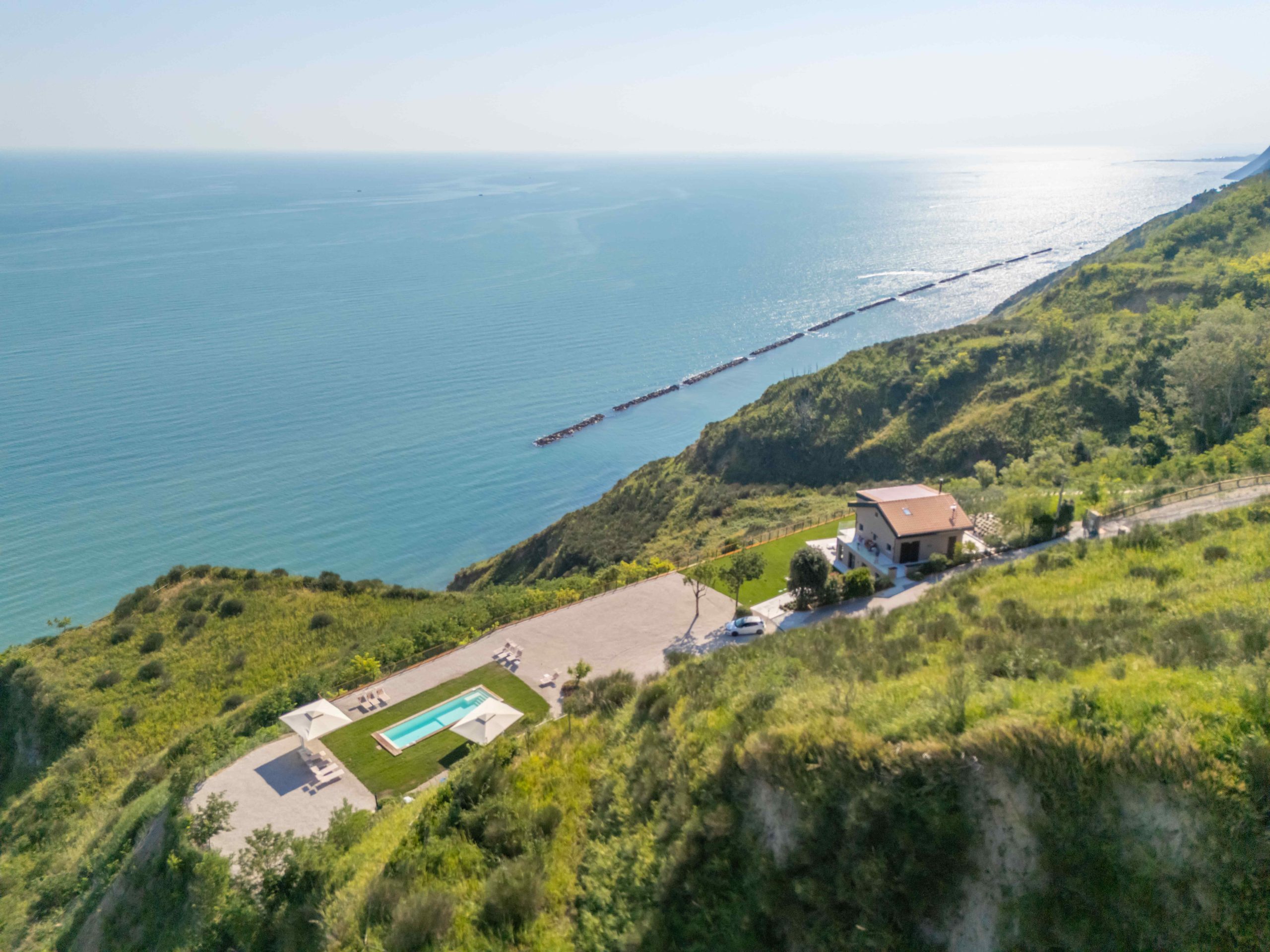 Terrazza Incanti domina il paesaggio dal crinale del Monte San Bartolo. Gli interni essenziali e luminosi si aprono verso il giardino, le vetrate portano dentro la luce e il mare. Ogni ambiente vive in dialogo con il paesaggio, tra il blu dell’orizzonte e il verde del parco. La veranda, le cucine esterne, la piscina: ogni spazio è pensato per vivere all’aperto, con il comfort del design e l’eleganza sobria del lusso naturale.